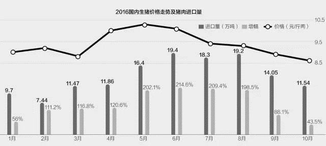 農(nóng)業(yè)部數(shù)據(jù)顯示:我國生豬價格在今年5月份達到每斤10.3元的頂峰后,便開始進入下滑區(qū)間。海關數(shù)據(jù)顯示:今年前十個月中,豬肉的進口量在6月份達到峰值,為19.4萬噸,同比增長達214.6%,也是增量的最高值。在此之后,進口量與進口增量均出現(xiàn)了逐月下滑。